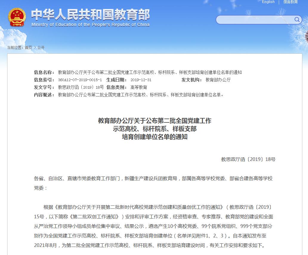 近日,教育部发布《教育部办公厅关于公布第二批全国党建工作示范高校、标杆院系、样板支部培育创建单位名单的通知》(教思政厅函〔2019〕18号),我校商务经济学院教工第一党支部入选教育部全国党建样板支部。根据《教育部办公厅关于开展第二批新时代高校党建示范创建和质量创优工作的通知》安排,今年8月,教育部启动了开展第二批新时代高校党建示范创建和质量创优工作。经资格审查、专家推荐、教育部党的建设和全面从严治党工作领导小组成员单位集中审议、结果公示,遴选产生10个高校党委、99个院系党组织、999个党支部分别作为全国党建工作示范高校、标杆院系、样板支部培育创建单位。