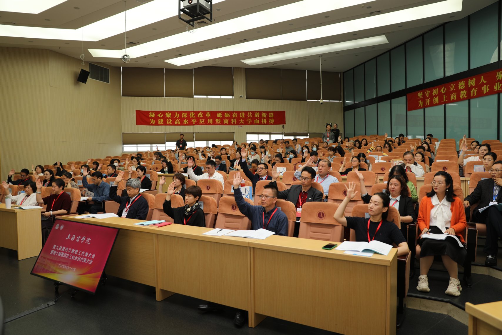 上午九时五十分,在庄严的中华人民共和国国歌声中,大会拉开帷幕。校党委副书记、校长吴忠以《聚焦改革谋发展,踔厉奋发开新局 奋力谱写高水平应用型商科大学建设新篇章》为题作学校行政工作报告。他从“坚持高标准高质量,扎实做好巡视整改工作;落实立德树人根本任务,全面提升人才培养质量;推进人事人才体制机制改革,建设高素质专业化教师队伍;持续深化改革,优化学科专业与二级学院机构;强化科研协同联动,科研产出量质齐升;深化开放办学,服务国家和上海发展;加快内部治理体系建设,完成校园改造升级;多措并举做深走实,提升教职工参与感、获得感、幸福感”等八个方面回顾了学校过去一年取得的成绩,分析了学校当前在专业结构调整、高水平师资队伍建设、高水平科研成果、社会服务管理机制等方面存在的问题。