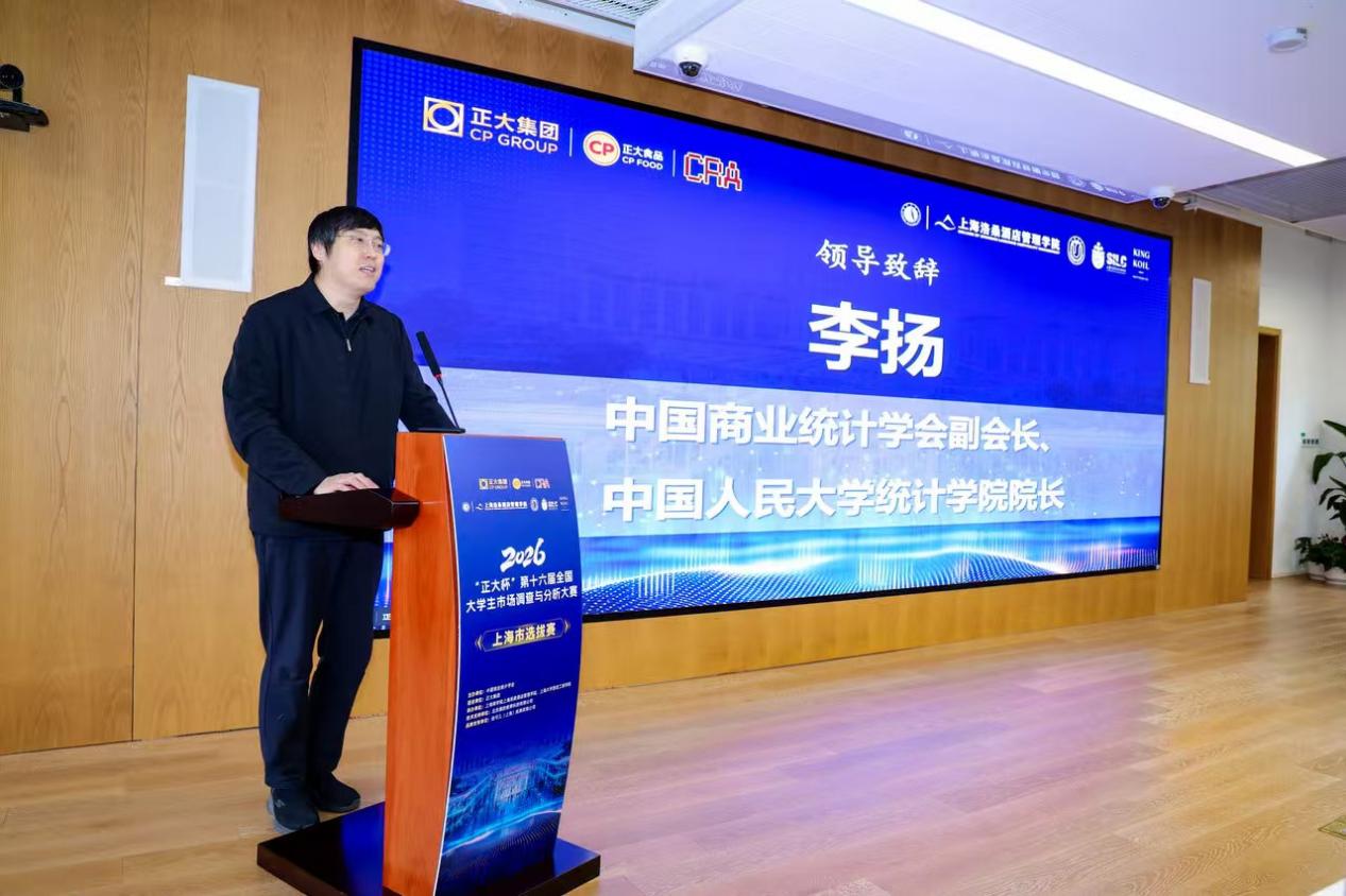 中国商业统计学会副会长、中国人民大学统计学院院长李扬代表主办单位致辞。他强调,国家高度重视应用型人才培养,大赛是践行新时代育人理念、衔接校园与社会的优质实践载体,为青年学子提供了运用专业知识解决实际问题的广阔舞台。他期待参赛同学将课堂知识转化为实践能力,以诚信参赛、精益求精的态度交流互鉴、共同成长,真正做到学以致用、知行合一,展现上海高校学子的专业素养与青春风貌。