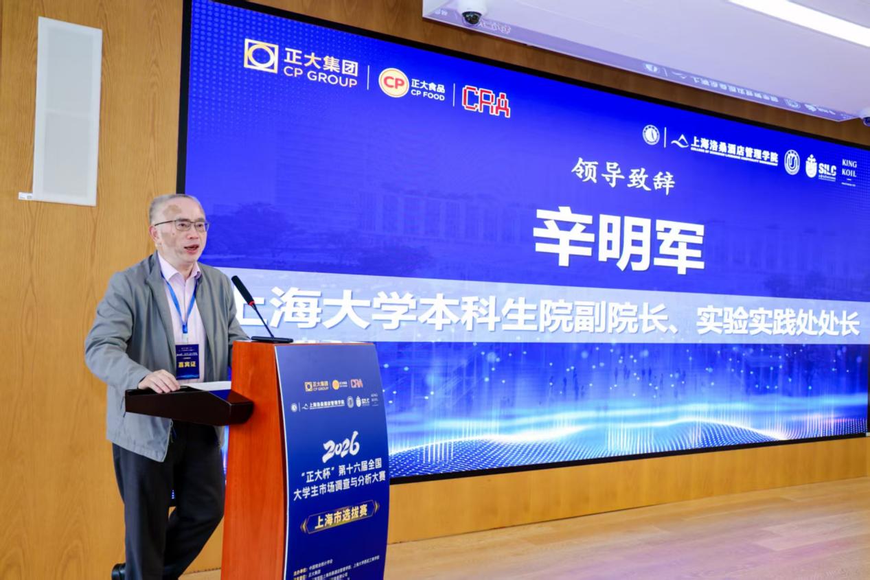 上海大学本科生院副院长、实验实践处处长辛明军在致辞中表示,全国大学生市场调查与分析大赛是连续多年位居全国高校学科竞赛榜单前列的公益性品牌赛事,是检验大学生数据处理与市场分析实战能力的“试金石”,更是衔接教育链与产业链的重要桥梁。上海大学高度重视实践教学与创新人才培养,将全力保障赛事顺利开展,为参赛师生提供优质服务。他希望同学们以严谨态度开展调研、以专业方法分析数据,在团队协作与交流互鉴中提升能力,以实干担当彰显青年风采。