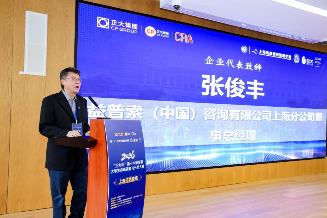 企业代表、益普索(中国)咨询有限公司上海分公司董事总经理张俊丰结合行业实践分享前沿洞察。他表示,益普索作为全球领先市场研究机构,始终关注并支持青年人才成长,市场调查与分析是洞察商业本质的核心能力,大赛是培育专业人才的一流平台。他寄语参赛同学立大志向、守专业初心,在学习与实践中锤炼心智、强化逻辑,用数据与专业能力服务行业发展,益普索也向优秀青年人才敞开大门。
