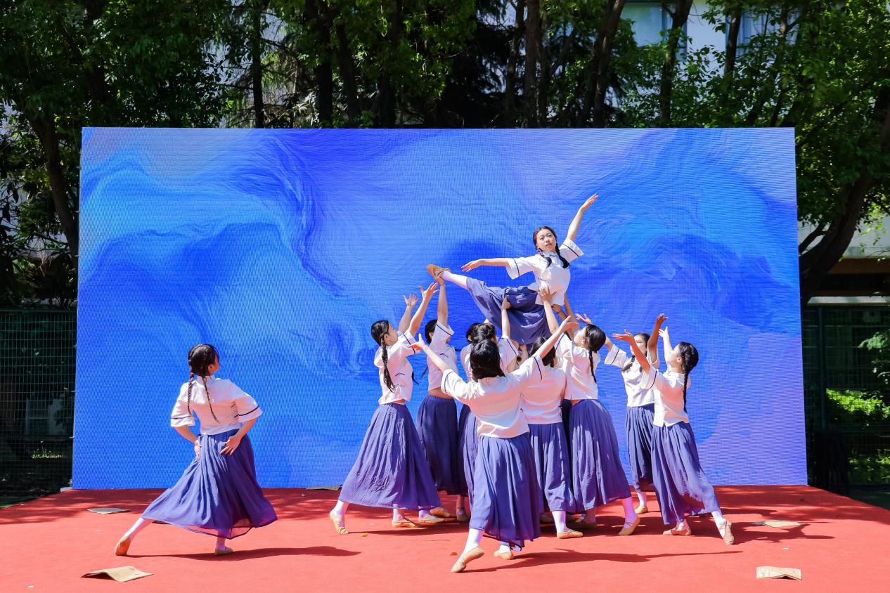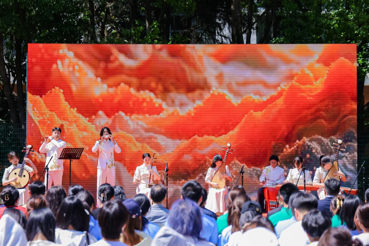 风采闪耀舞台,青春积蓄力量。民乐合奏、舞蹈《觉醒时代》展现了新时代青年朝气蓬勃的精神风貌,全场师生齐唱中国共产主义青年团团歌,激昂的旋律与飘扬的团旗交相辉映,展现上商青年昂扬奋发的青春朝气。