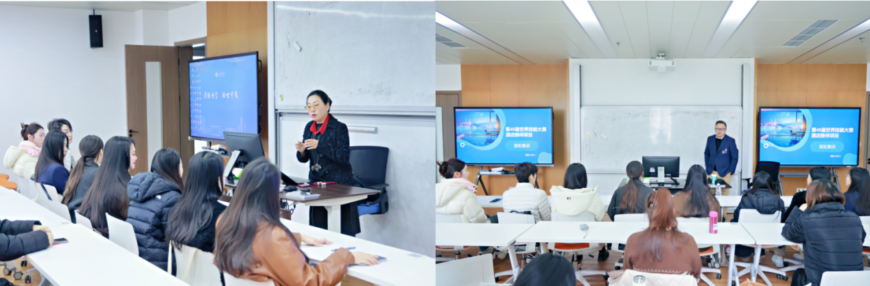 上海集训基地负责人姜红、第48届世赛酒店接待项目中国技术指导专家组组长胡晓授课