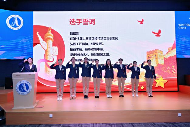 杭州第一技师学院选手张奕欣作为选手代表发言,她感谢各级领导、专家和教练的悉心指导,代表全体选手庄严承诺:将以最饱满的热情、最坚定的意志投入训练,精益求精、锤炼技能,力争在世赛舞台上展现中国酒店接待技能人才的最高水平,为实现技能报国梦想而努力拼搏。上海商学院选手王嘉艺作为领誓人,带领全体10位集训选手庄严宣誓:“在第48届世赛酒店接待项目集训期间,弘扬工匠精神,刻苦训练,精益求精,锤炼过硬本领,坚定技能成才、技能报国之路,不负期望,不负韶华,为实现中华民族伟大复兴的中国梦贡献力量!”