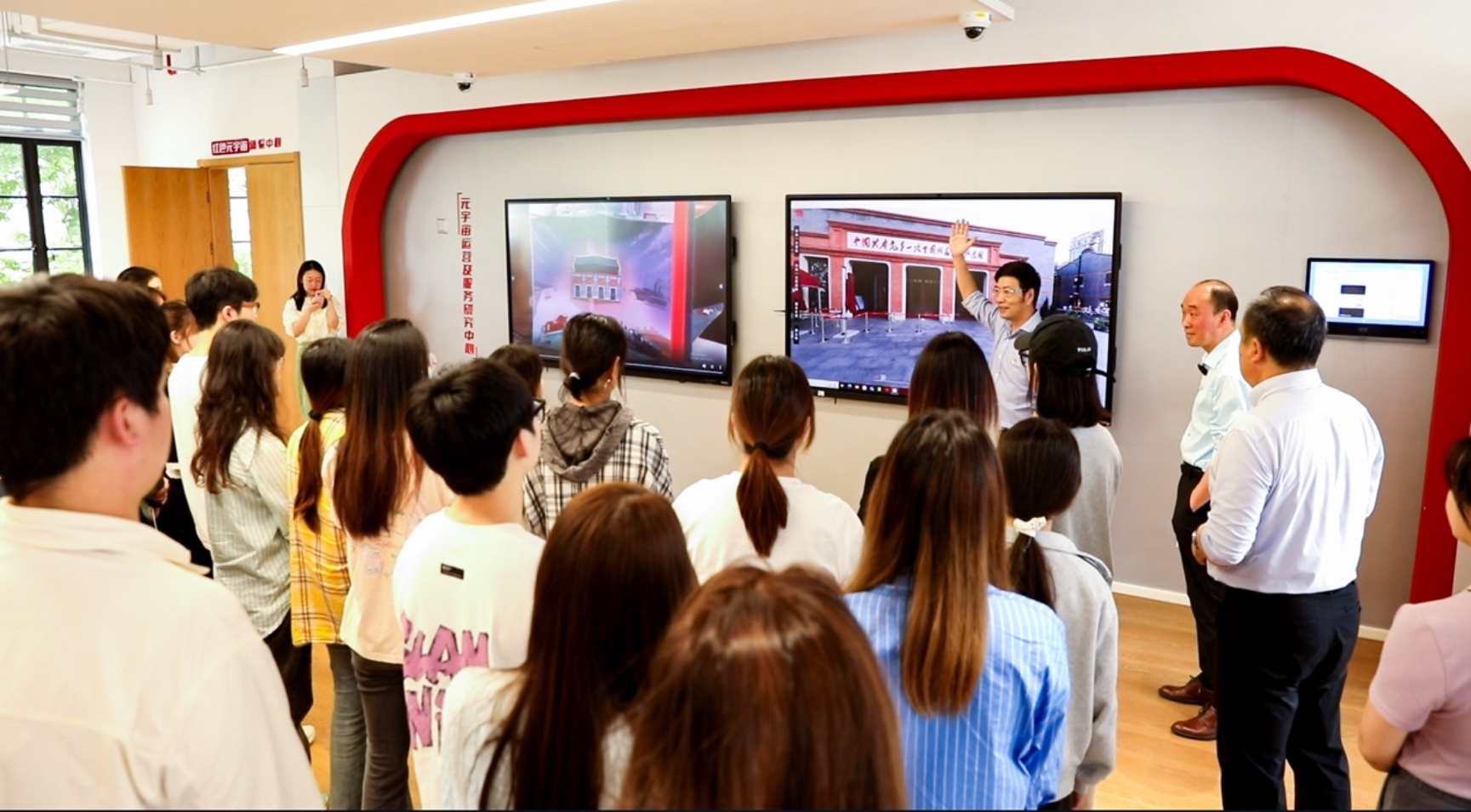 上海商学院与一大纪念馆联合建成了新媒体元宇宙实验室,在观摩导学环节,宋晓光书记和周自豪老师带领同学们走进元宇宙实验室,通过虚拟现实技术,重温了中国一大纪念馆的珍贵场景,深入了解中国共产党早期组织的成立背景和历史贡献。创新运用洞穴式沉浸式系统体验,同学们仿佛置身于历史现场,亲身感受到革命先辈们的奋斗历程。