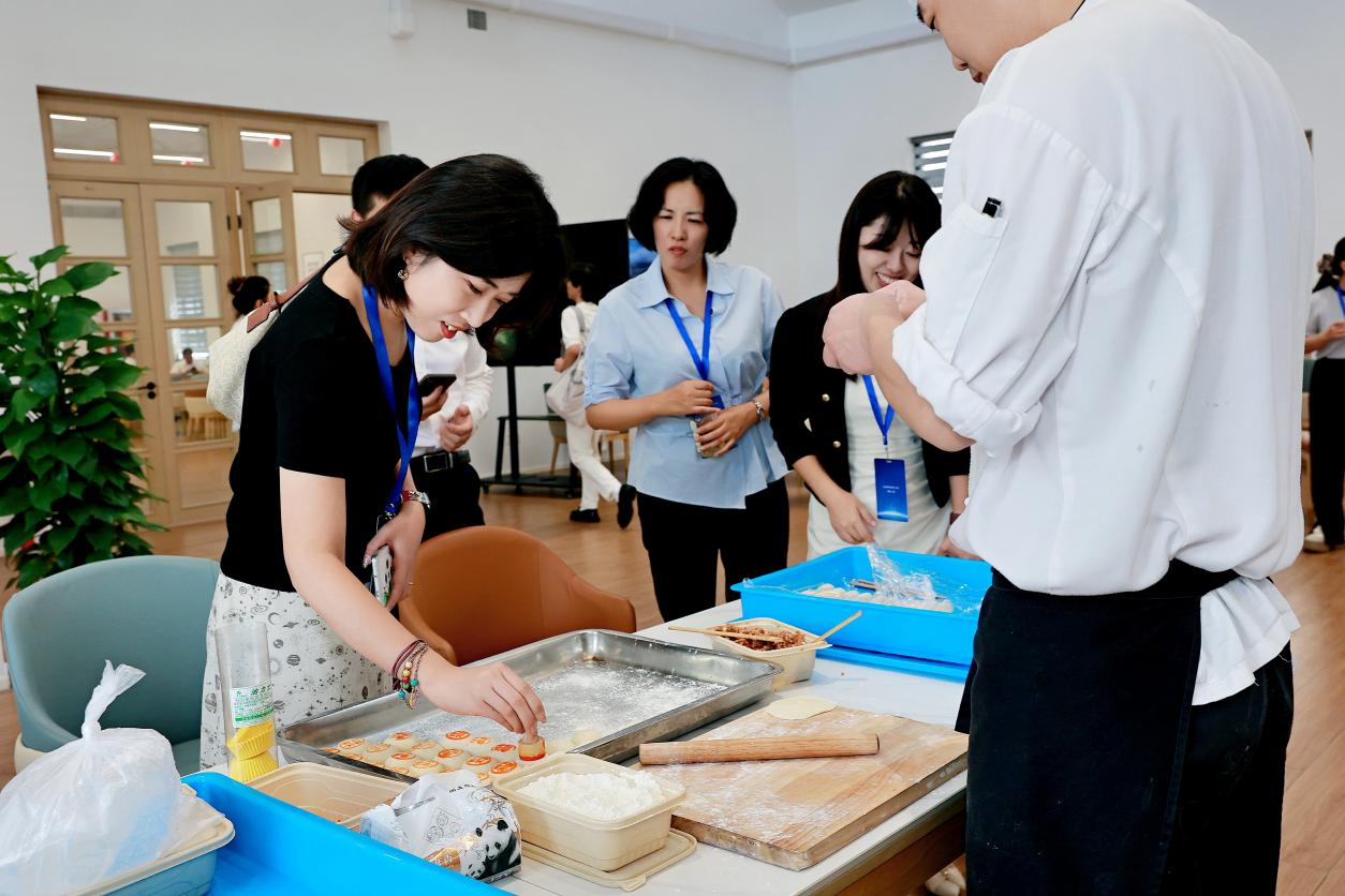 上海洛桑酒店管理学院邀请共同体牵头单位锦江集团现场展示鲜肉酥饼的非遗制作,嘉宾现场体验了制作过程,随后实地走访对漕宝路校区的办学环境、教学设施与实践平台有了更直观了解。