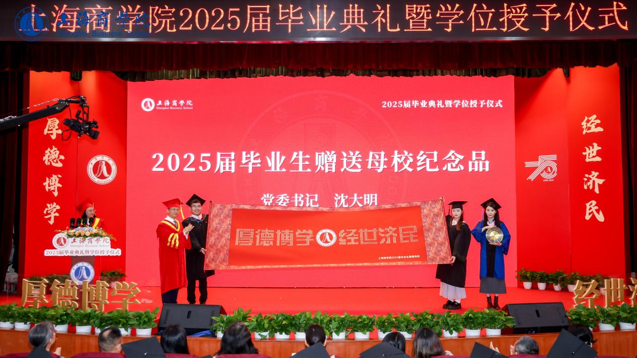求学路上,同学们用脚步丈量祖国山河,用智慧点亮全国舞台,用汗水浇灌出累累硕果,每一份付出都化作闪耀的功章,这既是对时代的响亮回答,更是奔向未来的坚实底气。典礼上,同学们共同观看毕业纪念MV《我们》。张绍华宣读《关于表彰2025年度市级、校级优秀毕业研究生的决定》《关于表彰2025年度市级、校级优秀毕业生的决定》,张洁、张绍华为荣获2025年度市、校级优秀毕业生代表颁发荣誉证书。商务经济学院国际商务专业研究生吴秋婵作为研究生代表发言,商务外语学院商务英语专业本科生徐铃权作为本科生代表发言,他们感谢学校坚实的平台、系统的培养,老师们的谆谆教诲,让每一位毕业生都成为有责任、有担当、有温度的人。毕业之际,2025届全体毕业生向母校赠送纪念品,祝福母校在商科发展的道路上,蒸蒸日上,再铸辉煌!校党委书记沈大明代表学校接受了毕业生赠送给学校的纪念品。