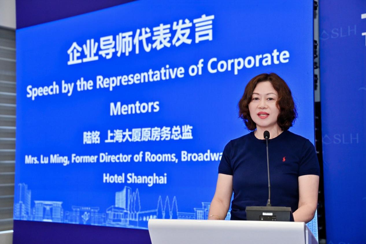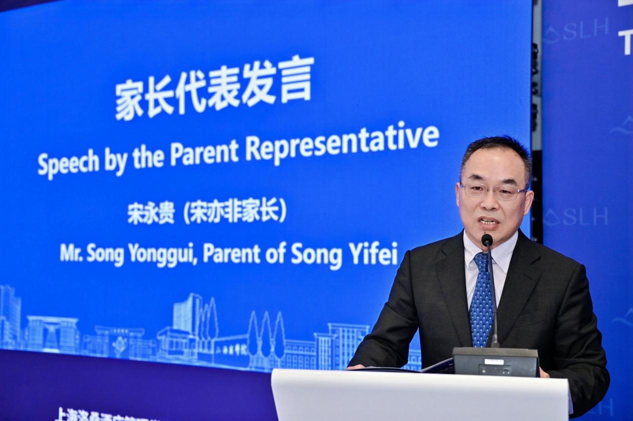饮其流者怀其源,学其成时念吾师。这份师恩,跨越国界,情谊深重。学院酒店管理专业负责人万方舟作为教师代表发言,并为毕业生送上祝福。她教导同学们,无论人生将你带往何方,请永葆好奇心,坚守勇气,怀揣善意。不忘初心,将成功与挫折都视作成长的经纬,努力成为“以正直为骨、以同理心为魂、以凌云志为翼”的前行者。上海大厦原房务总监陆铭作为企业导师代表发言。她作为第一届毕业生的企业带教老师,向圆满完成学业的同学们表示祝贺,并诠释了企业对未来菁英的深切期许。她希望各位学子以匠心守护服务初心,用智慧驾驭行业变革,自强不息、求真务实,书写属于自己的精彩人生。与此同时,远隔重洋曾为毕业生们授课的EHL酒店管理商学院的教师们也为毕业生们发来了云端祝福。他们愿毕业生们始终保持对行业的热忱,无论是面对复杂多变的酒店运营场景,还是充满挑战的行业变革,都能凭借扎实的专业素养和创新思维从容应对,在全球酒店行业舞台上绽放光彩。毕业生家长宋永贵先生作为家长代表发言,他衷心感谢校方提供的优质教育资源和广阔发展平台,感谢每一位辛勤付出的老师,并鼓励毕业生们寻梦而行、向阳而生,树立正确的价值观和人生观,创造属于自己的辉煌,为社会的进步贡献自己的力量。毕业生家长王陈发来线上祝福视频,代表毕业生家长向教导学生成长的校领导、老师、后勤管理者表示最衷心的感谢,并希望毕业生们常怀感恩之心,与时代同频、与祖国同行,做眼中有光、心中有爱、脚下有风的追梦者。典礼上,2025届毕业生代表向教师、职能部门、后勤服务部门代表献花。