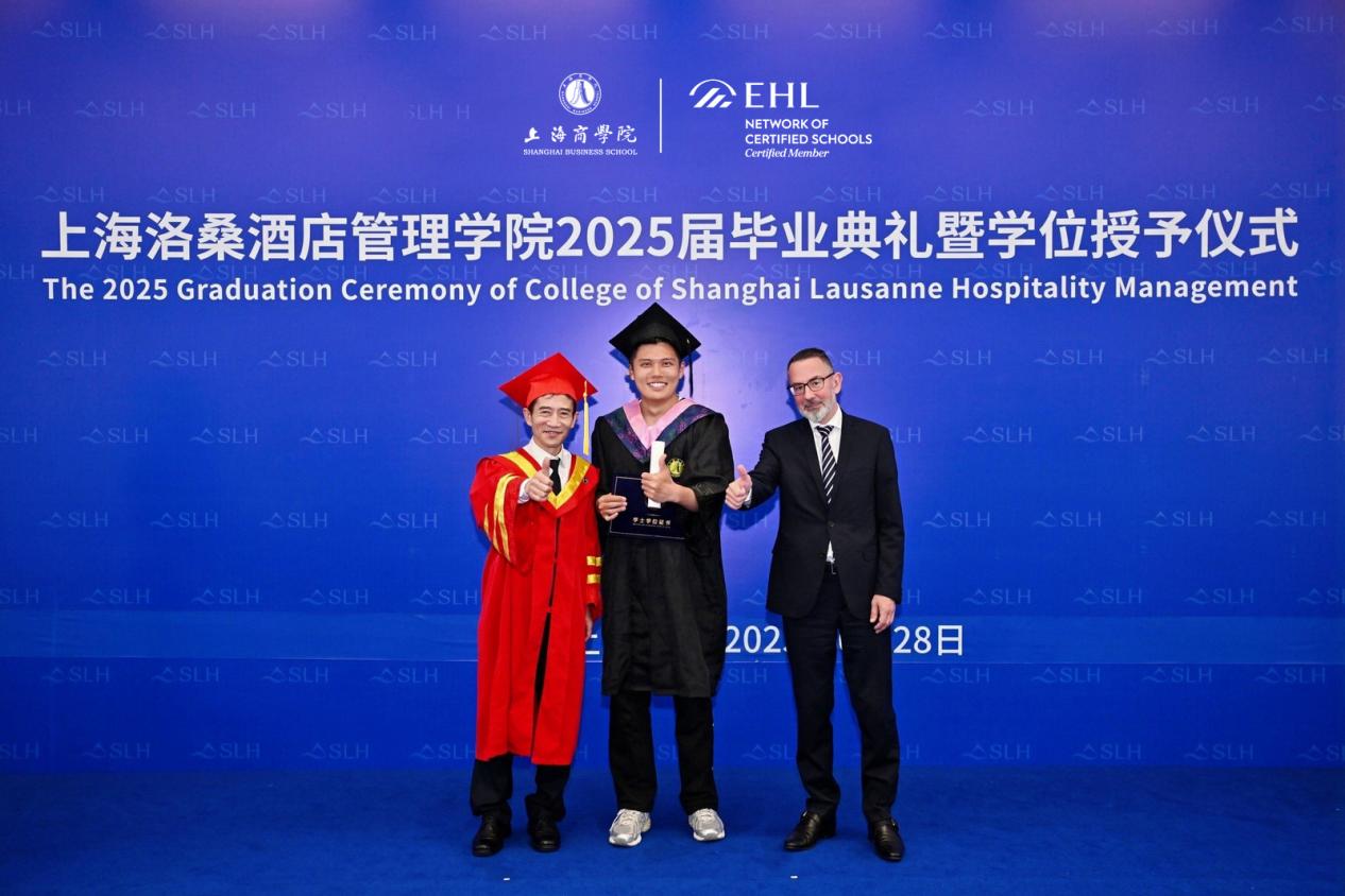 梧桐浓绿,栀子飘香。6月28日上午,上海商学院上海洛桑酒店管理学院2025届毕业典礼暨学位授予仪式于漕宝路校区隆重举行。作为中瑞深度合作办学的标杆项目,学院作为EHL认证院校联盟成员,承袭百年教育底蕴与上海商学院本土化办学优势,历经四年精心培育,迎来首批毕业生。EHL集团首席学术官胡安·F.佩雷隆,上海商学院校长吴忠,党委副书记、副校长劳晓芸、东湖集团副总经理彭立俊、锦江集团副总裁周维、携程集团副总裁王强以及各相关单位领导,教师代表、后勤服务职工代表,全体2025届毕业生及家长代表出席毕业典礼,共同见证2025届毕业生圆满完成学业,为他们即将开启的璀璨未来送上真挚祝福。典礼由学院执行院长胡笑寒、毕业生代表吴中岳主持。以“瑞辉同耀忆菁莪、瑞沪师韵铭心灯、瑞风韶华启新程”三篇章,勾勒出了首届学子从求学问道到逐梦远航的成长轨迹。