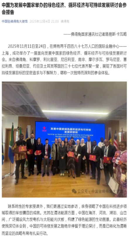 在为期两周的研修中,来自包括佛得角在内的11个国家共37名代表齐聚中国,围绕绿色经济、循环发展与可持续议题展开深入交流与实地考察。路易斯在文中写道,过去对中国的印象多源于媒体报道,而此次亲身研修使他得以“亲眼见证”。通过与专家对话、互动研讨及实地走访能源科技企业、观察城市治理细节,他与学员们共同认识到——可持续发展在中国并非抽象概念,而是扎实推进的国家战略和融入日常的社会实践。他由衷感慨:“中国并非在准备未来,而是在创造未来。”