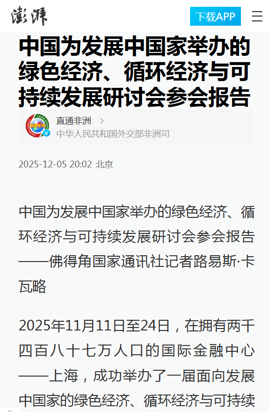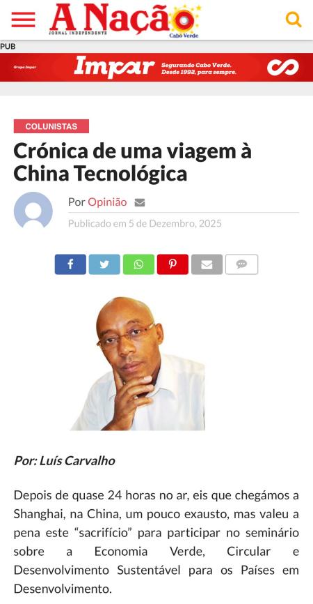 近日,佛得角国家通讯社记者路易斯·卡瓦略(Luis de Carvalho)在当地主流媒体《民族报》(A Nação)上发表署名文章《中国科技之旅纪行》,分享其参加由商务部主办、我校承办的“发展中国家绿色循环经济与可持续发展研修班”的经历。文章发布后,迅速获得中国驻佛得角大使馆官方转发,并被澎湃新闻等国内权威媒体转载,引起广泛关注。