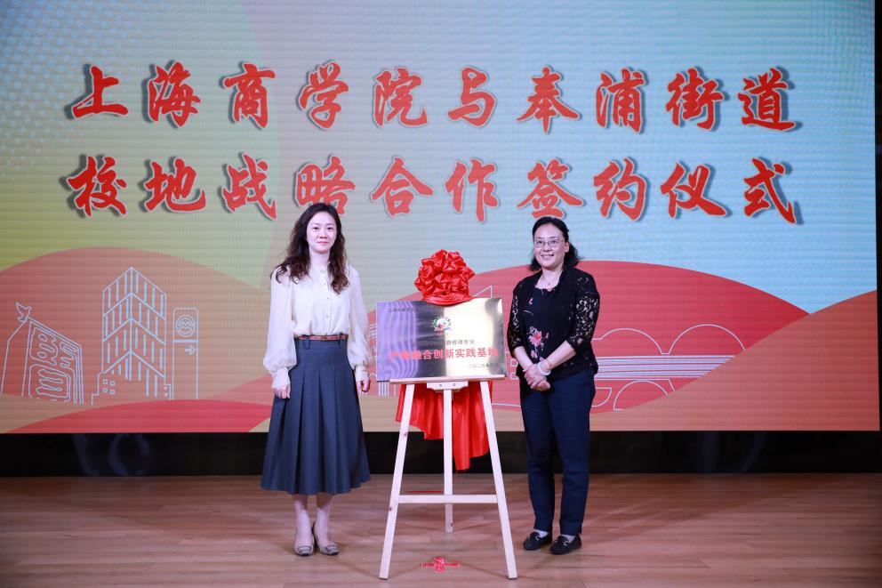 上海商学院党委副书记、副校长劳晓芸,奉浦街道党工委书记、人大工委主任李晓芬共同为旅游管理专业产教融合创新实践基地揭牌