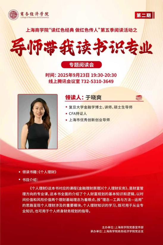 上海商学院“读红色经典 做红色传人”第五季阅读活动之“导师带我读书识专业”专题阅读活动至此已圆满落幕,此次专题阅读活动将第一课堂与第二课堂相结合,将专业教育与书香育人相结合,既是对立德树人根本任务的生动践行,也是高校在育人实践中运用鲜活载体与多元路径的积极实践。