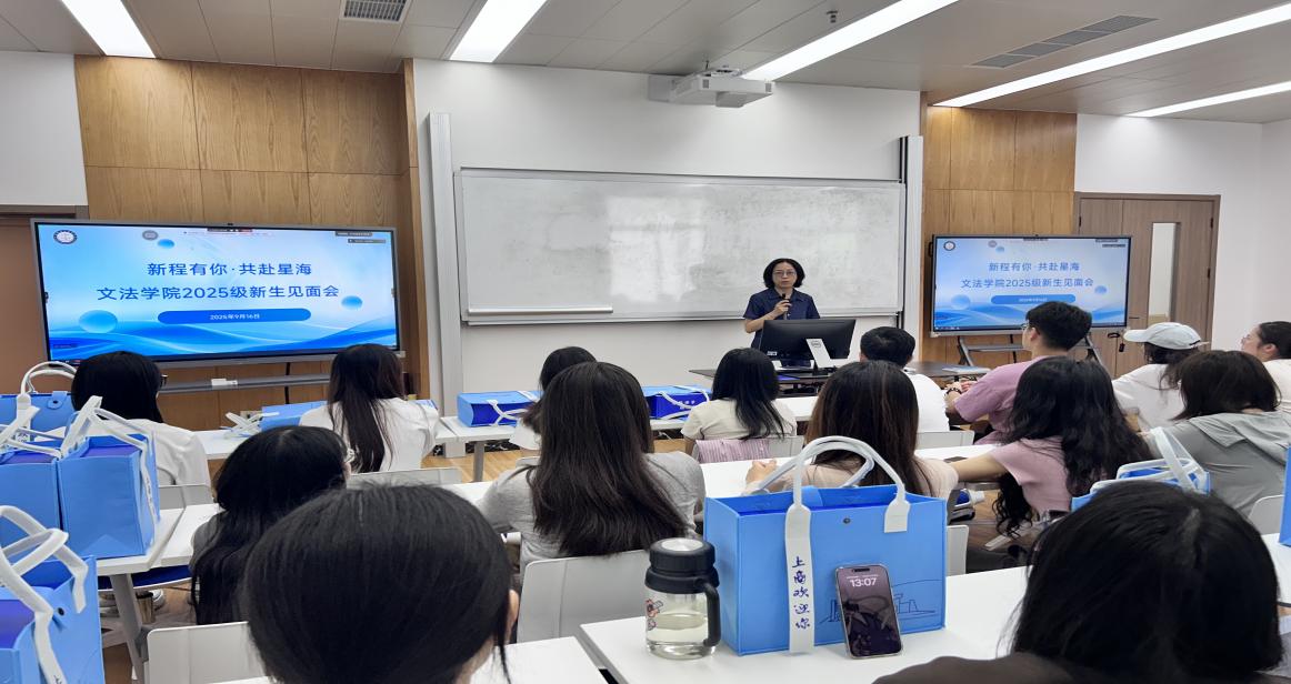 9月16日下午,上海商学院文法学院2025级新生见面会暨专业介绍会成功举行。文法学院党总支书记朱永莉、院长卢宁、副院长曹锐、社会工作系主任刘东、法学系主任何爱华,新生辅导员们及2025级全体新生参加了此次会议。会议由党总支副书记、副院长林丽娜主持。