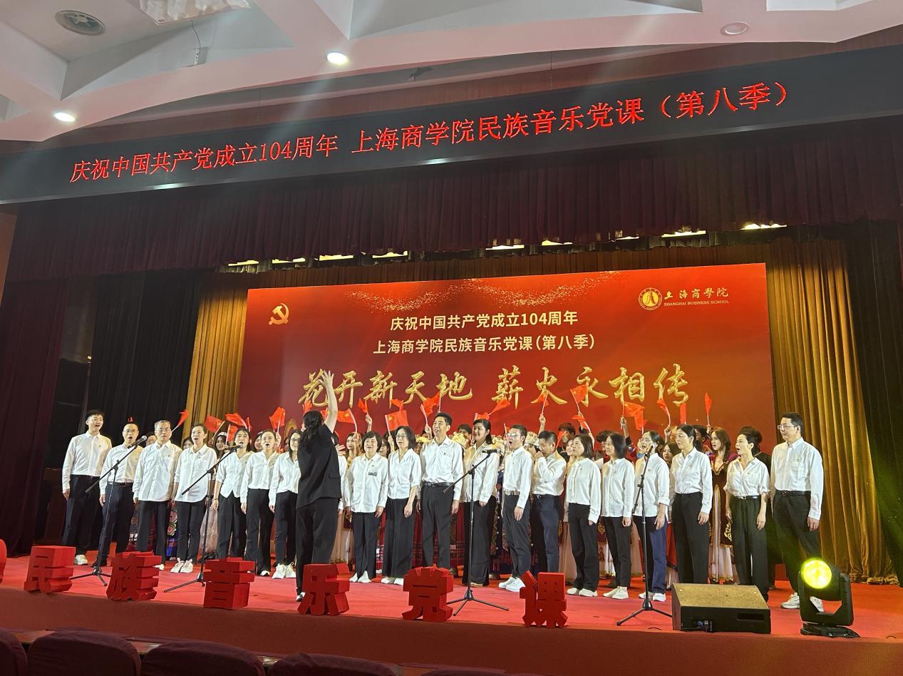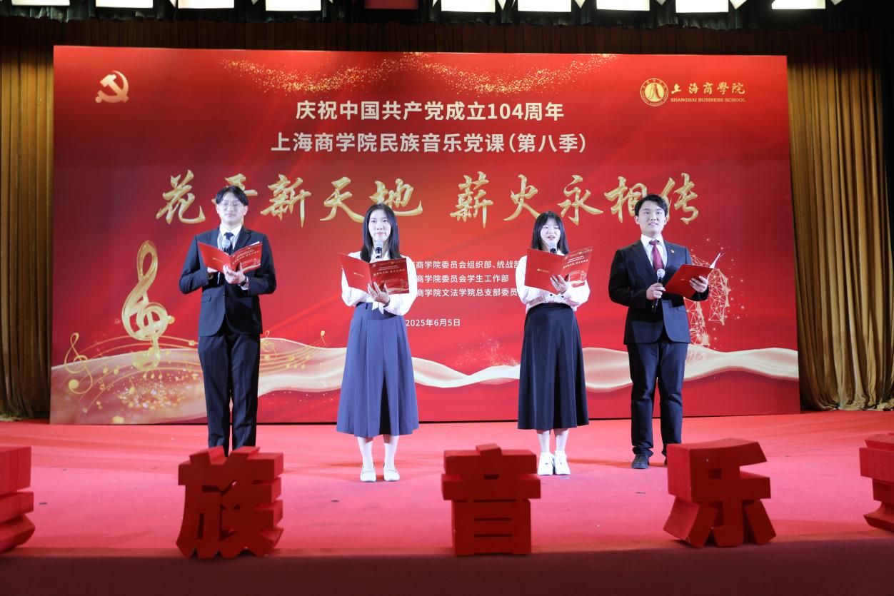 为庆祝中国共产党成立104周年,巩固拓展学习贯彻习近平新时代中国特色社会主义思想主题教育成果,巩固深化党纪学习教育成果,锲而不舍推进深入贯彻中央八项规定精神学习教育,创新抓好青年教师党员、学生党员学习载体,2025年6月5日,以“花开新天地 薪火永相传”为主题的上海商学院民族音乐党课(第八季)在奉浦校区146号报告厅成功举办。用歌声激活红色基因,沉浸式党课让信仰“声”入人心,活动旨在通过音乐形式奏响新时代党性教育的创新乐章。