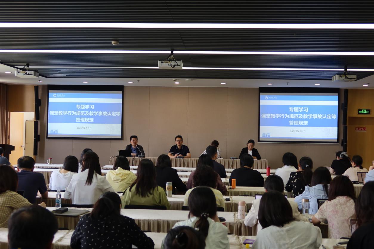 为深入贯彻本科教育教学审核评估要求,全面提升育人质量,商务经济学院于6月3日组织全体专业教师开展教学管理文件专题学习,聚焦课堂教学行为规范、教学事故认定及教学档案管理三大重要文件。学院党政领导班子、全体教师参会。