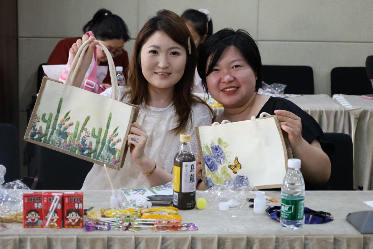 随后,校友们移步至综合楼703及辅楼F201,在那里,学院为校友们精心准备了“巧手织梦,创意归巢”--DIY蝶古巴特包制作与花束扭扭棒体验活动,现场洋溢着欢乐与温馨,校友们兴致勃勃,积极参与。