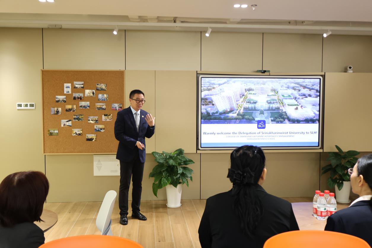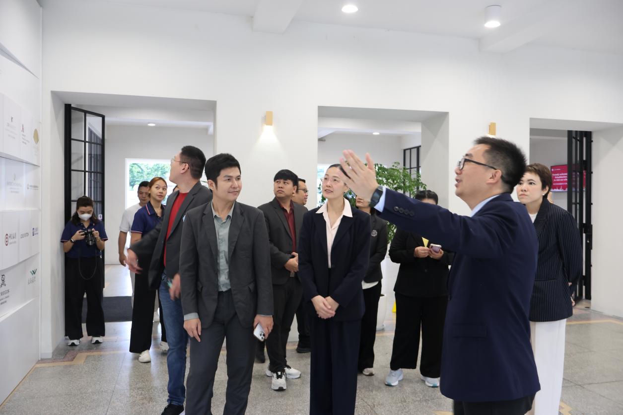 在欢迎仪式上,杨雨萌老师对参训人员表示热烈欢迎,并向大家简要介绍了培训课程安排。希望本次培训不仅是教育管理经验的跨国传递,更是中泰高等教育界探索创新合作模式的重要尝试。随后,学院副院长席宇斌向各位介绍了学院的基本概况、人才培养模式及产教融合路径。最后,他对双方在教育理念与实践领域进行深度对话表示期待,希望通过此次培训,双方共同解锁全球化教育管理新思路。