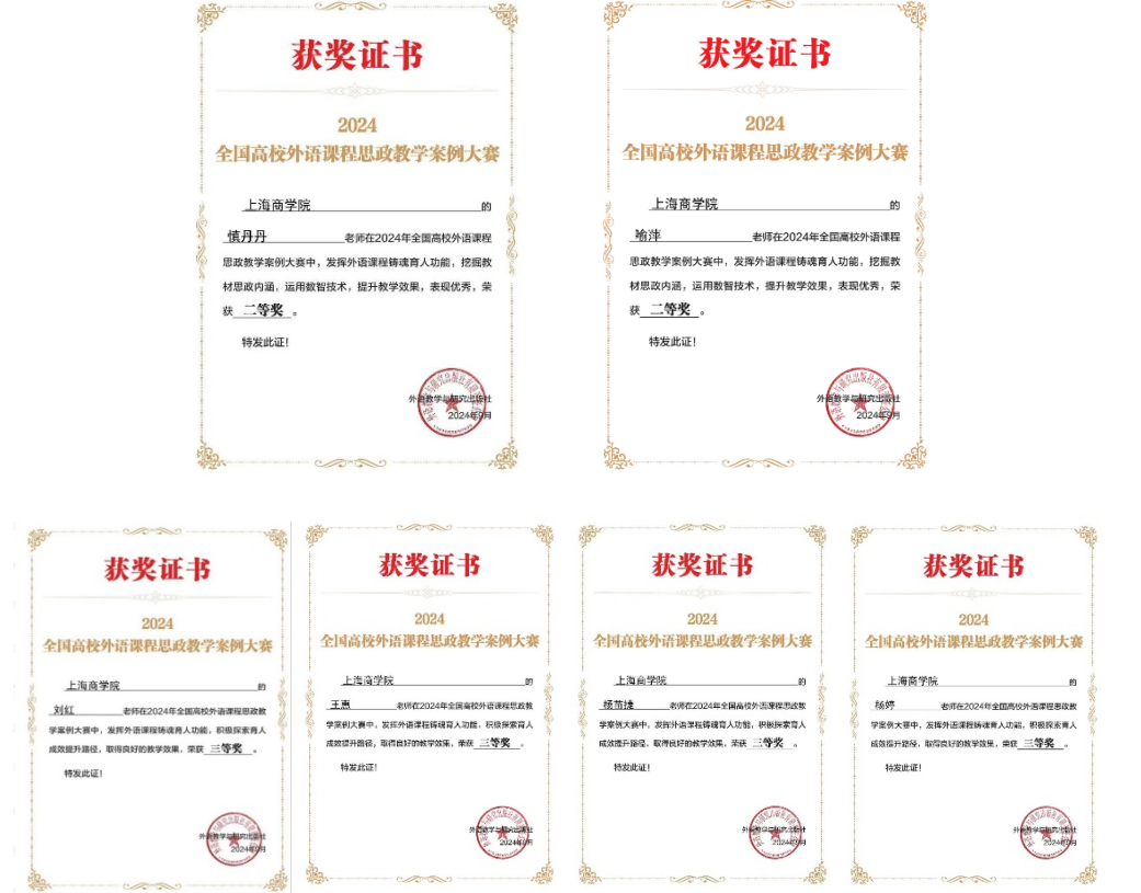 近日,2024年全国高校外语课程思政教学案例大赛获奖名单公布,我校商务外语学院商务英语系6名教师的课程思政教学案例作品在此次赛事中脱颖而出,慎丹丹、喻萍2位教师荣获主赛道二等奖,刘红、王惠、杨苗捷、杨婷4位教师荣获主赛道三等奖。