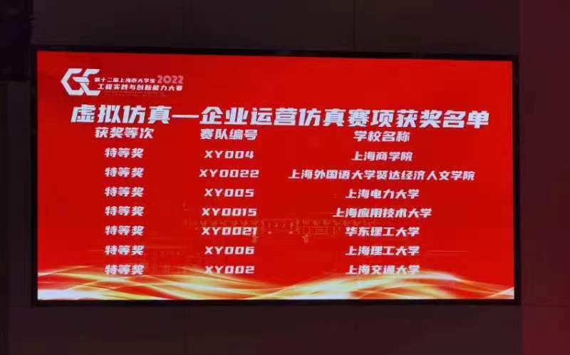 第十二届上海市大学生工程实践与创新能力大赛虚拟仿真赛道企业运营仿真赛项上海市赛于2022年12月17日在上海交通大学张江高等研究院成功举办。本次比赛由上海市教育委员会主办,上海交通大学(学生创新中心)承办,汇聚了来自上海交通大学、同济大学、上海大学、上海师范大学等18所上海高校的135支队伍。在我校教务处和工商管理学院(现代流通国家级实验教学示范中心)共同组织下,我校共有38支参赛队报名,通过校赛最终选出2支队伍参加市赛,经过一天激烈的比赛,我校获得了特等奖一组(指导老师:华君敏,洪贤方),二等奖一组(指导老师:华君敏,沈华夏),特等奖的参赛队将代表我校参加国赛(教育部主办的面向全国大学生开展的“三大赛事”之一)。