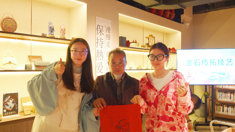 非遗工坊成员修一纯和杨林同学参与体验上海市非物质文化遗产项目——“金石传拓技艺”,上海市非遗项目金石传拓技艺传承人王克华老师进行现场指导。金石传拓是我国古代发明的一种独特“复印”技术,是将纸张紧覆于金石器物之上,用墨拓手法,将器物图形、纹饰、铭文等内容忠实复印到纸上的技法。同学们将墨水用滚轮滚在刻制好的雕版上,再将一方红纸覆盖上去,接着用另一把滚轮用力拓印,一幅栩栩如生的拓印画作就呈现在眼前。