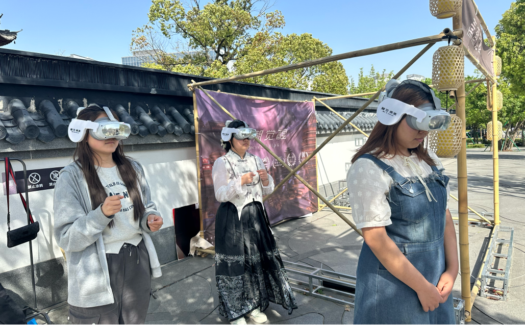 此外,非遗工坊成员孙锦雯、彭佳欣和赵青同学,亲身体验了“秦潮觉醒”XR大型沉浸式探索项目。该项目借助元宇宙 XR 视觉科技,秦潮觉醒融合历史、科幻等元素,直接穿越到异次元空间。看完精彩纷呈的非遗表演后,体会到科技赋能文化,感受到AR技术带来的时空穿越体验。同学们感叹该项目的奇妙,表示未来会继续探索“文旅+元宇宙”的应用。