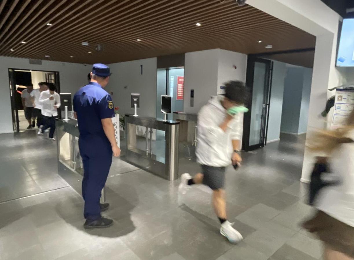 消防逃生演练的引导员到位后,新生规范使用湿毛巾捂口鼻、弯腰低姿,沿逃生路线有序疏散至安全区,完成人数清点上报。