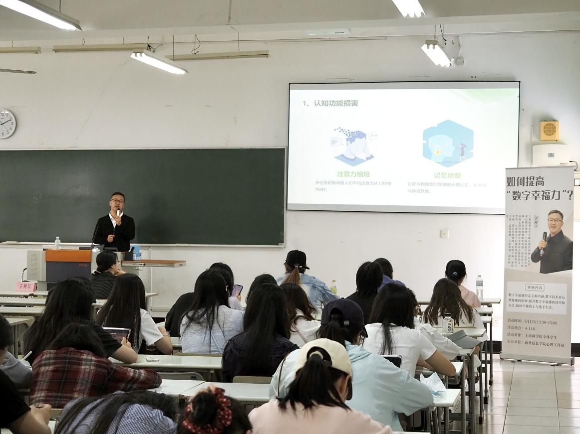 为助力大学生正确认识数字技术对心理的影响,掌握数字时代提升幸福感的科学方法。商务信息学院于2025年5月13日在4教118教室举办了如何提高“数字幸福力”心理主题讲座,本次讲座特邀请到上海海事大学专职心理咨询师王树江副教授主讲,讲座由翁冬娇主持。