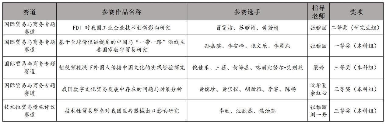 近日,2024年全国高校商业精英挑战赛国际贸易竞赛(RCEP 国际市场开拓策划赛道、国际贸易与商务专题赛道、技术性贸易措施评议赛道及涉外商事法律服务赛道)全国总决赛圆满收官。由我校商务经济学院国际经济与贸易系教师张雅丽、梁婷、沈华夏、余红心、刘一丹等共同指导的五支学生团队分别荣获大赛本科组一等奖和三等奖,及研究生组二等奖,教师荣获优秀辅导教师奖,学校荣获最佳院校组织奖。