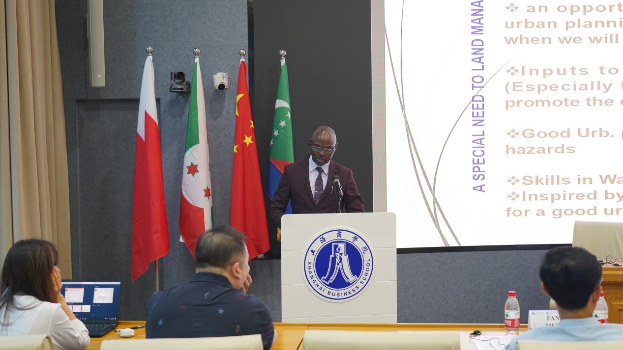 学员代表来自布隆迪城市规划、住房和建设局局长列奥尼达·尼比吉拉(LEONIDAS NIBIGIRA)先生(副部级)首先介绍了布隆迪在城市发展中面临的各类以及以及城市发展2040年愿景。他期待通过研讨班的交流探讨,为各参训国带来有益的启发,提升各国城市规划与建设水平。最后他代表全体学员向中华人民共和国政府及项目承办单位上海商学院表示了由衷的感谢。