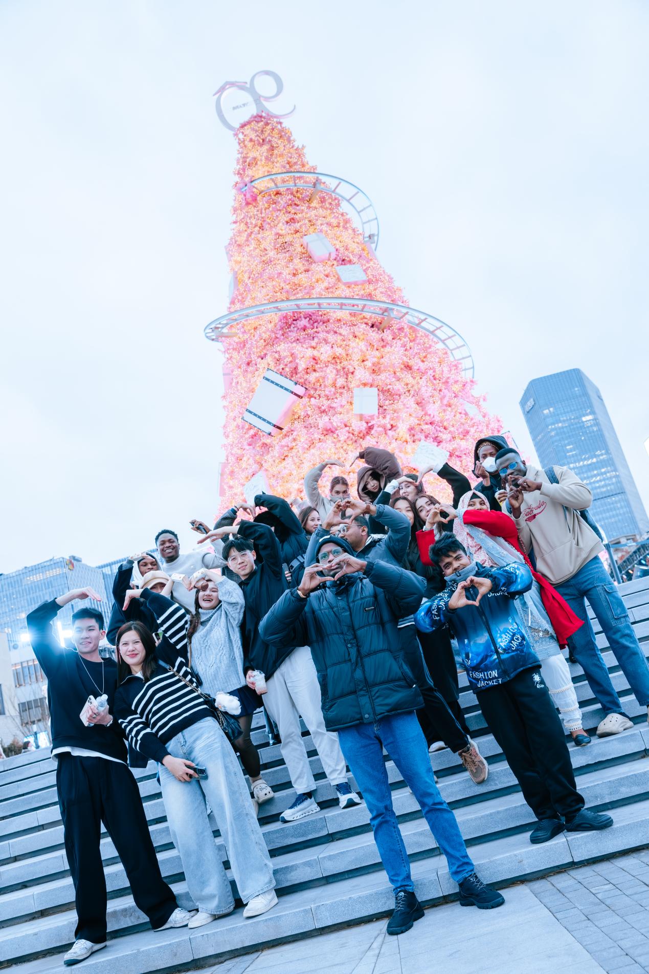 留学生在徐汇区文化和旅游部和发展中心的工作人员引导下,首先来到西岸美术馆。西岸美术馆由获得普利兹克奖(建筑界的最高奖项)英国建筑师戴卫-奇普菲尔德设计。在馆内,留学生将邂逅国内首个全面、系统性梳理“激浪派”艺术的大型展览《偶然!激浪派!》。大家在导览员的带领下,穿梭于200余件蓬皮杜馆藏真迹之间,与“观念艺术之父”马塞尔·杜尚;与激浪派创始人乔治·麦素纳斯;与“社会雕塑家”约瑟夫·博伊斯;与“事件艺术代表”乔治·布莱希特;与“女性主义艺术先行者”小野洋子”近距离跨时空对话,体会建筑与展品对话的独特氛围。随后,一行人从沿江步道出发,沐浴在阳光下漫步黄浦江畔,步入西岸大剧院。剧院大堂以1540平方米的开放格局,打造沉浸式艺术体验场域。墙面采用大地色系陶板饰面,呼应徐汇滨江的工业肌理;吊顶以镜面不锈钢金属材质模拟水面波纹,与窗外黄浦江景形成虚实交融的视觉对话。大剧院三楼的“在水长廊”,不仅是眺望黄浦江景的绝佳窗口,更是一个多维度的城市文化界面。留学生在这里既可将百年外滩建筑群与江面游船尽收眼底,又能俯瞰西岸梦中心的潮流商业街区场景;我们每一次的驻足都将成为与黄浦江对话的独特记忆。沿着滨江步道,继续参观西岸梦中心,这里既保留水泥厂“敞开与拥抱”的基因,也将工业肌理与现代需求融合,细节兼顾了城市记忆与生活品质。既保留了工业遗存风格、又注入现代艺术气息的空间。正在举办的“万花筒仓 双旦花市”市集,作为对工业遗存的创新利用,以“万花筒”为灵感,汇集了鲜花绿植、花艺文创、宠物用品等20余个特色摊位,留学生可以随心漫步,邂逅惊喜,直观感受到历史厂房与现代商业文化功能的有机融合。从国际青年的视角观察城市更新的脉络,体会文化、商业、艺术与科技融合带来的创新活力。在行程中,徐汇区文化旅游服务和发展中心的工作人员与留学生还围绕城市发展、艺术生态、可持续设计等议题展开多语种交流。