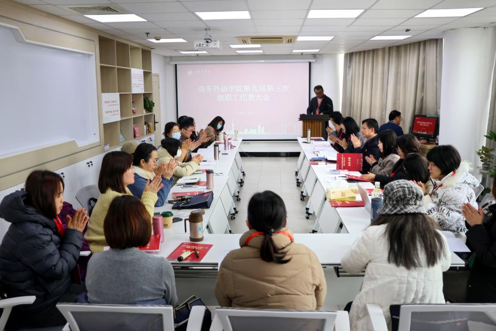 1月7日下午,商务外语学院第九届第三次教职工代表大会在奉浦校区行政楼407会议室顺利举行。31名教职工代表、2名列席代表齐聚一堂,凝聚共识,共谋学院发展。会议由党总支副书记、副院长胡安华主持。