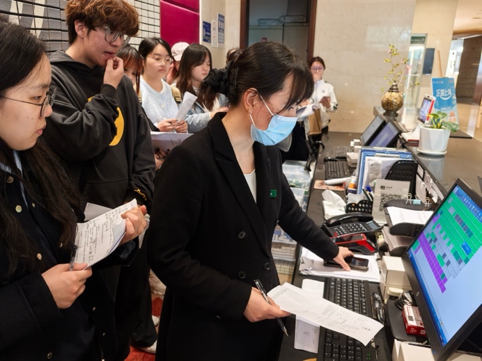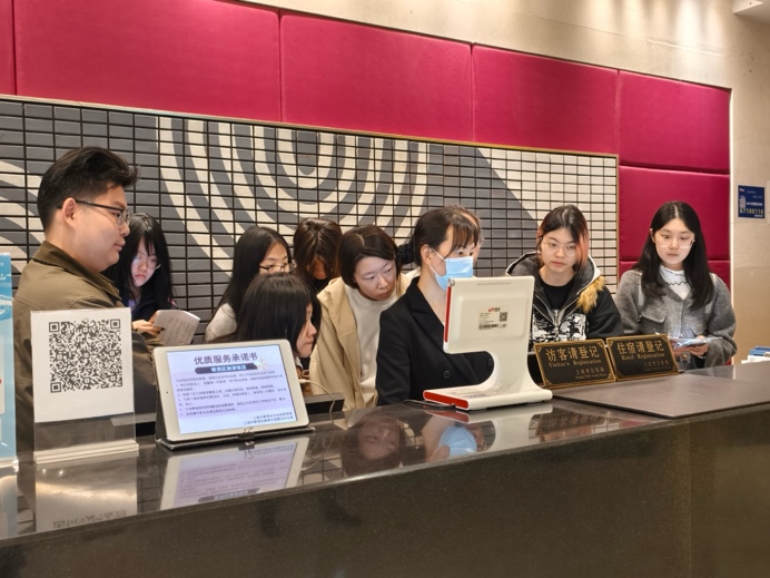 在前厅部,同学们观察了前台接待、礼宾服务流程,并围绕“如何提升入住体验”等问题与工作人员互动交流。前厅部张经理为同学们演示了完整的入住登记流程,重点讲解了绿云系统的操作规范。