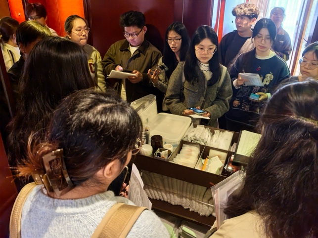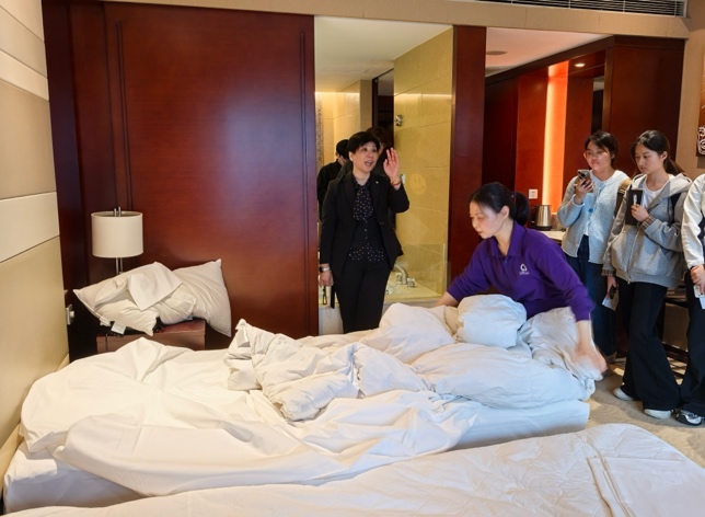 随后,同学们来到酒店客房。在参观不同房型的过程中,客房工作人员现场演示了布草更换、清洁标准及智能设备应用,让同学们直观感受精细化管理的要点。经理介绍了客房清洁车和布草房的配置种类和容量,解开了同学们的许多疑惑。
