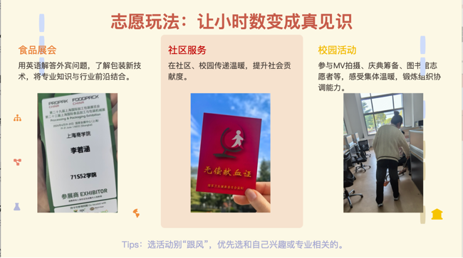 此外,酒店管理(中本贯通培养)231班梁悦琪分享“学业深耕+多角色平衡”经验;旅游管理231班吕亚丹围绕专业定位给出实习竞赛、时间管理建议;旅游管理231班王倪佳强调要保持积极心态,提议新生利用上海资源拓展眼界;食品质量与安全232班李若涵则建议大家筑牢专业基础,用拆解法巧妙化解难题。
