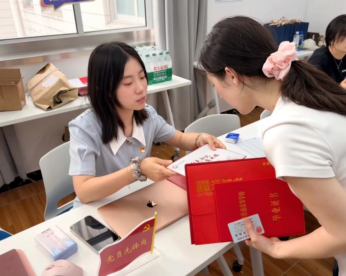 在迎新现场,特别设立了“党员先锋岗”,成为一道亮眼的红色风景线,党员志愿者佩戴党徽,热情为新生分发红色“三件套”、入党“五还要”,通过这份红色礼物,为新生树立红色坐标,加强对新生的理想信念培养,引导他们在研究生阶段在专注学术深耕与专业能力成长的基础上,主动了解党组织、积极向党组织靠拢,将个人发展与社会需求、党的事业紧密结合,成长为有理想、有担当,能以专业力量服务社会的新时代社工人才。