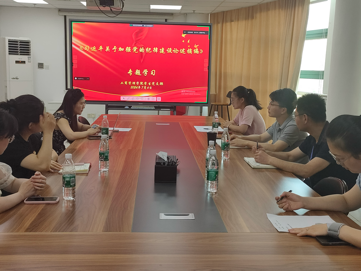 为深入学习贯彻习近平总书记关于党纪学习教育的重要讲话和重要指示精神,不断强化师生党员的纪律观念和规矩意识,引导党员学纪、知纪、明纪、守纪,真正把纪律规矩转化为政治自觉、思想自觉、行动自觉。工商管理学院学生党支部于2024年7月4日开展了《习近平关于全面加强党的纪律建设论述摘编》 专题学习。上海商学院纪委副书记蔡磊列席观摩,工商管理学院学生党支部全体党员出席,活动由学院学生党支部书记高雯主持。