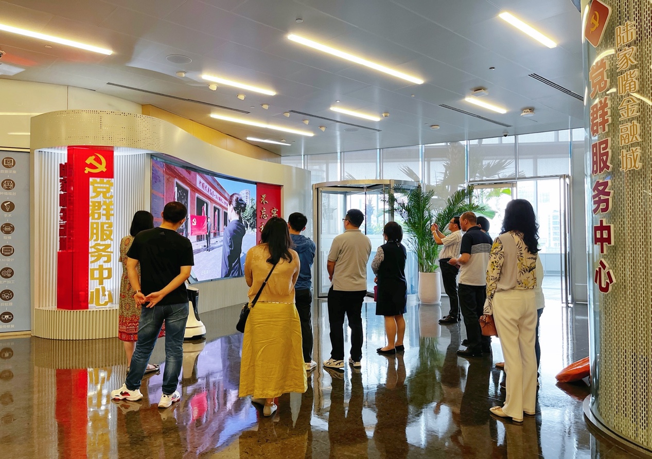 在机器人讲解员“陆小二”的带领下,马克思主义学院一行参观了信息发布厅、政治生活厅、区域联建厅、党群工作站、空中花园活动区等五大功能区域。陆家嘴金融城31.78平方公里,集聚了285幢商务楼宇,入驻企业4万多家,从业人员50多万,平均年龄29.5岁,在摩天大楼里的垂直社区如何开拓新时代楼宇党建新格局是个难题。多年来,结合总书记讲话,陆家嘴金融城党群服务中心不断拓展基层党建的领域、搭建楼宇党建平台、探索“楼事会”制度、创新治理方式、加强服务功能、与时俱进地适应新形势。截至2023年1月,陆家嘴金融贸易区综合党委下辖“两新”党组织达到432个,覆盖非公有制企业2000余家,党员10633名,一栋栋楼宇成了一座座党建“红色营地”。