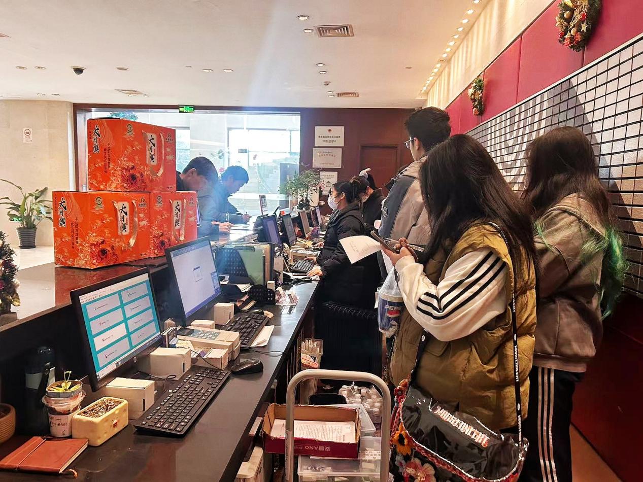 活动伊始,师生们在酒店大堂集结,完成合影留念、纪律强调及任务卡分发后,每班学生皆分为两组,开启了分模块、沉浸式的探索之旅。在前厅区域,冯主管亲自带队讲解,不仅引导学子们现场观摩前台接待的入住与退房全流程演示,还细致展示了PMS酒店管理系统的操作界面与核心功能,让大家直观了解数字化工具在酒店运营中的应用逻辑。针对客诉处理这一核心工作,冯主管结合真实案例拆解应对流程与沟通技巧,深入浅出地解析了“以客户为中心”的服务闭环。此外,冯主管还带领大家参观了酒店宴会厅,介绍了场地布局、设施配置及大型活动承接的服务标准,拓宽了学子们对酒店多元服务场景的认知。