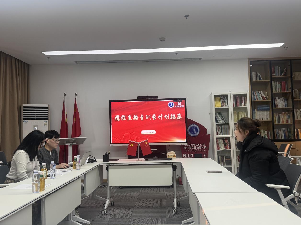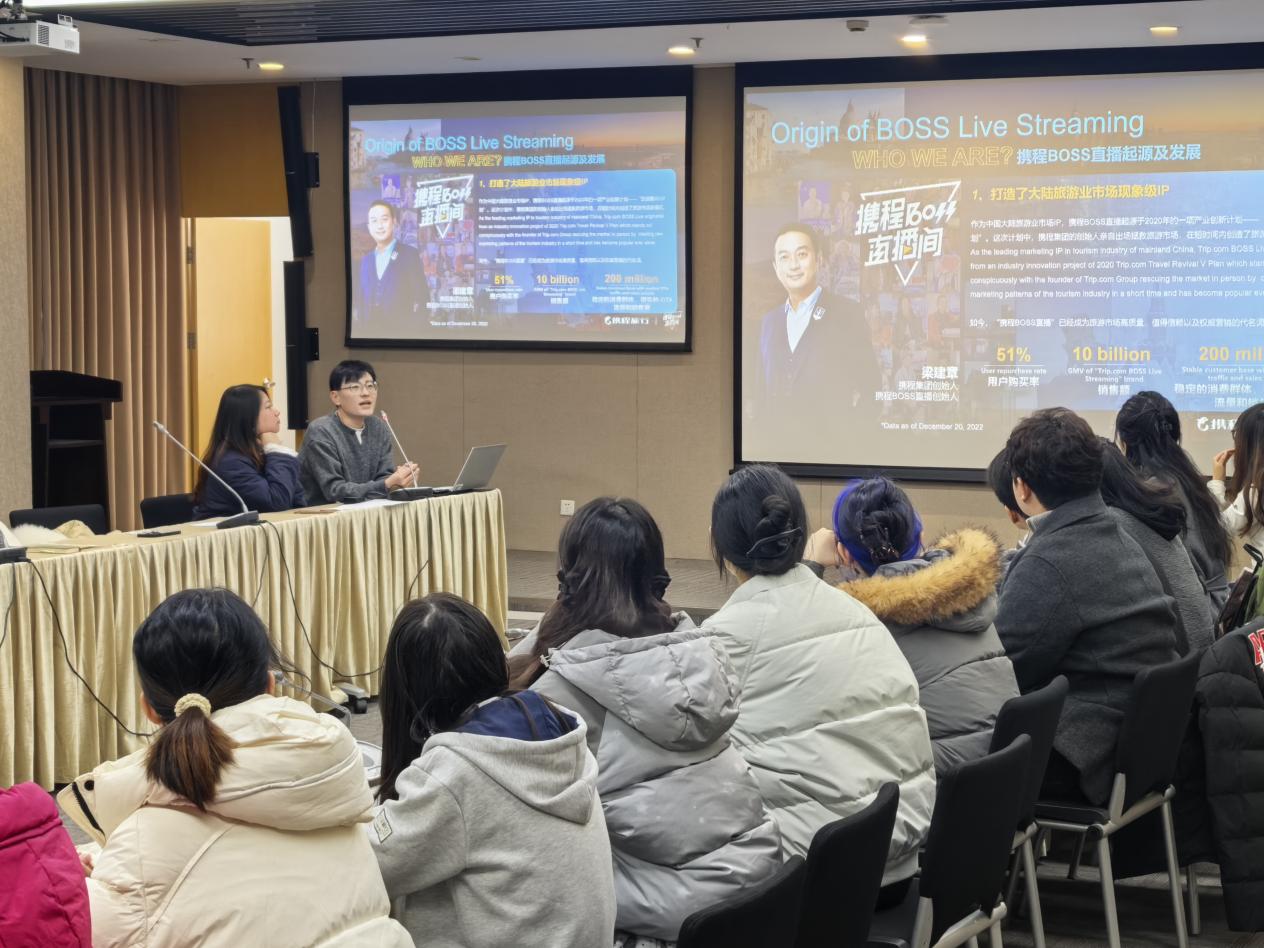 随后,活动进入携程直播项目宣讲环节。携程直播矩阵负责人吴奕辰详细介绍了携程直播项目的发展,展示了文旅直播在酒店产品推广、目的地营销中的应用价值,并介绍了项目为学员提供的专业培训、导师指导及实习就业等优质资源。
