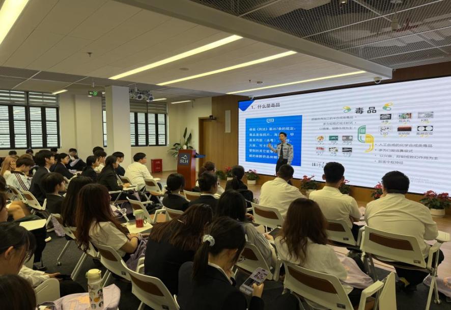 为进一步增强我校师生的毒品防范意识,筑牢校园禁毒防线,10月15日下午,学校联合徐汇区禁毒委员会办公室、田林街道平安办在漕宝路校区开展了一场毒品预防宣传活动,并特邀上海市崧泽强制隔离戒毒所张警官走进校园,在图书馆3楼报告厅为洛桑酒店管理学院全体大一新生带来了一场主题为“青春不‘毒’行,识破伪装,拒绝深渊”的预防毒品宣传讲座。