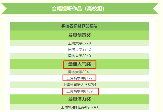近日,“青春放歌 唱享未来”2024年上海市学生合唱节获奖名单揭晓。上海商学院大学生艺术团合唱团在团委(大学生艺术中心)的组织和指导下,凭借出色表现,从众多参赛作品中脱颖而出,报送的1个合唱作品获得合唱展演作品高校组“最具创意奖”,报送的2个视频作品均获得合唱视听作品高校组“最佳人气奖”,同时,在38所参赛高校中评选出了13个“优秀组织奖”,我校位列其中。