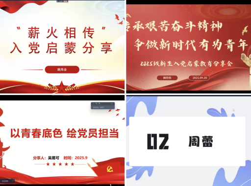 会上,四位党员围绕入党动机、行动实践与收获成长展开分享,强调入党是严肃的价值选择,需端正动机。毕业生党员姚炜业结合爷爷老党员家风,以220小时志愿时长、连任学生会执行主席等实绩,阐释“入党不是任务,是立德立功”的初心,介绍学生干部经历并鼓励2025级新生走出舒适区、向党组织靠拢;毕业生党员周蕾分享作为学院宣讲团成员宣讲党的二十大精神等经历,指出入党是关乎信仰与人生方向的抉择,大学是在迷茫与实践中沉淀内核的旅程;国家奖学金获得者吴易可以初心、担当、收获为核心,结合荣誉与疫情期间服务同学的经历,强调“责任感、使命感、归属感”的重要性,呼吁新生融入专业学习与第二课堂;在校生党员顾佳怡则以“传承艰苦奋斗精神”为主题,分析部分学生入党动机功利化等问题,结合青马工程实践与校外实习经历,建议低年级学生多参与活动锻炼能力,明确入党需先厘清个人动机。