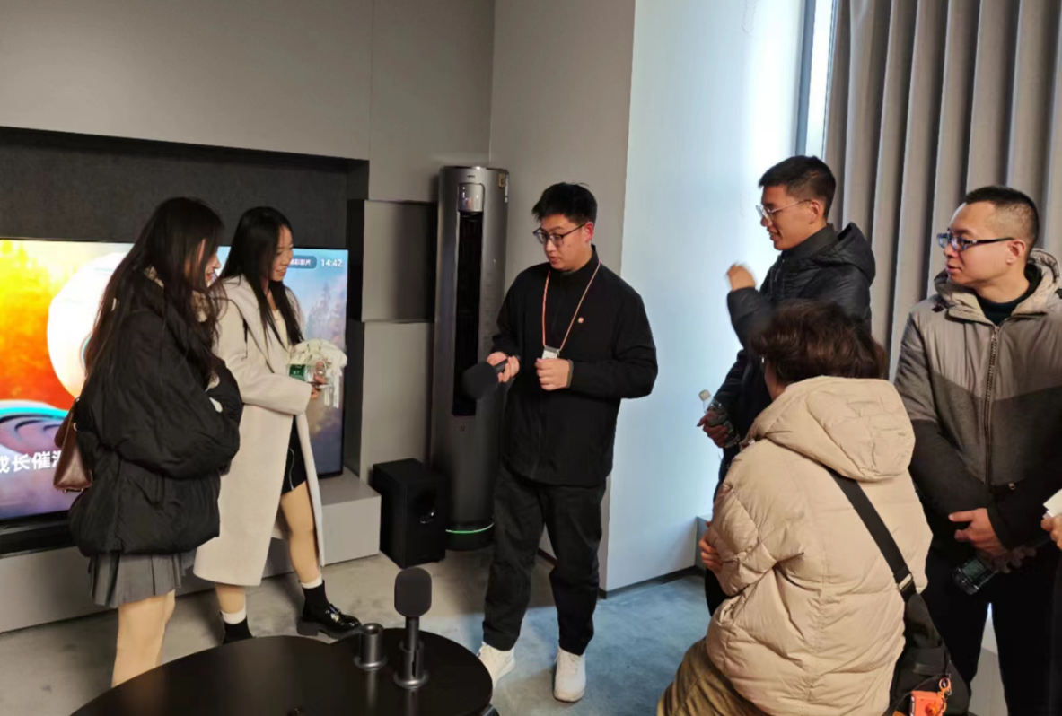 门店二层是小米家具设备的展厅,包含侧吸油烟机、分区洗衣机、智能扫地机、RO净水器、智联空调等,品种繁多,功能齐全,令人目不暇接。在了解具体产品后,专家带同学们走进了AloT(智能互联)体验间,在这里,从门锁到窗帘,从厨房家具到个性化灯光,诸多智能设备一应俱全。在同学们自由体验过程中,专家老师们指导了智能设备的使用,并仔细解答了同学们在体验过程中的疑惑。