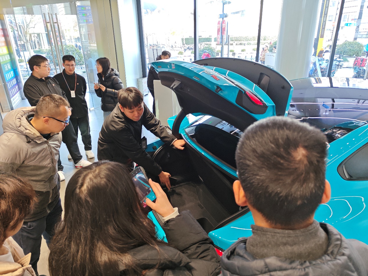 门店分为上下两层,一层包含新能源车及3C数码产品,首先由汽车高级销售主管李杨带来新能源车的介绍,他从车身外壳、灯光细节、人性化设计、涂漆工艺等方面对SU7的硬件设备做了详细讲解,并着重讲述了车载智能系统对驾驶体验的优化,邀请同学参与“试驾”体验,感受SU7集生活智能和美观实用于一体的驾驶和空间设计。