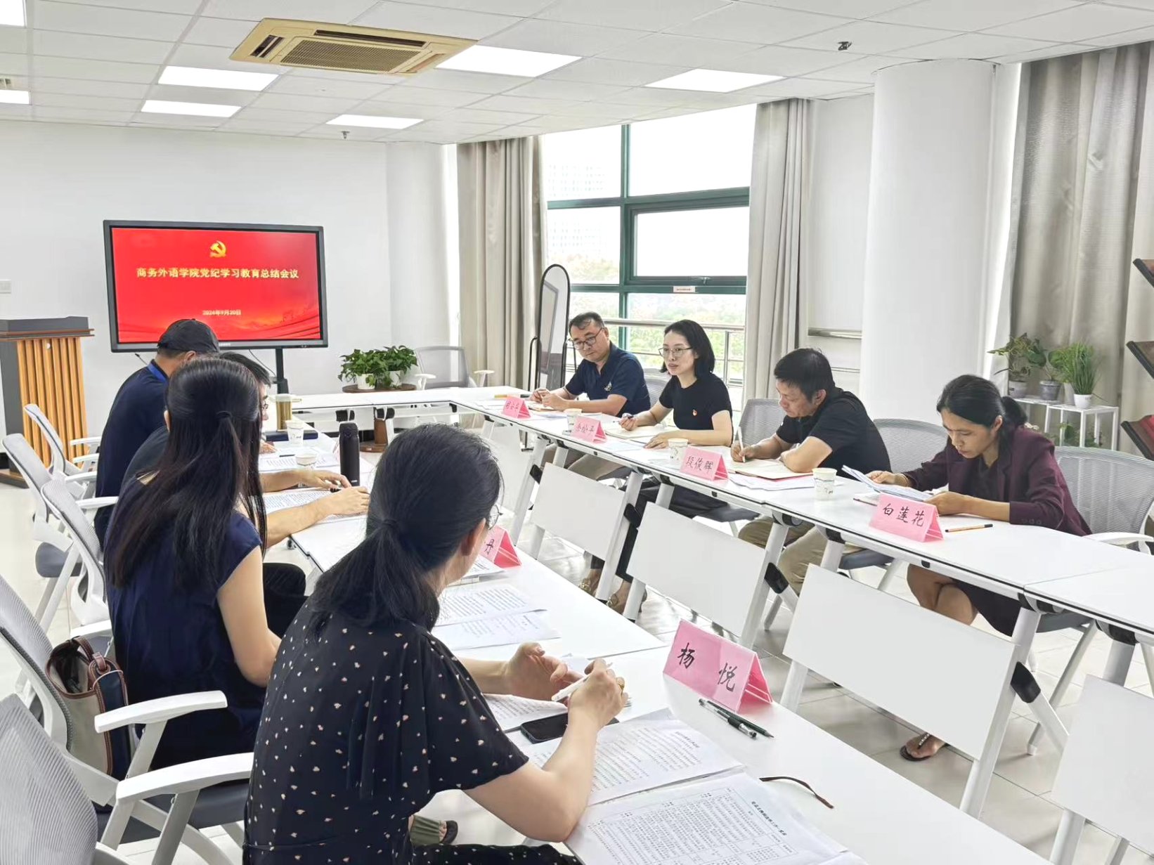 9月20日下午,商务外语学院党总支在行政楼407会议室召开学院党纪学习教育总结会议,对全院党纪学习教育进行全面回顾与总结,部署推进党纪学习教育常态化长效化。学院党总支委员、各支部书记参加了会议。会议由党总支书记余绘平主持。