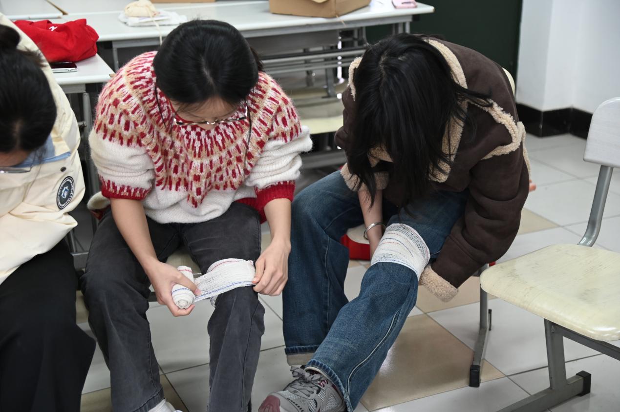 本次培训内容丰富多样、实用性强,采用理论与实践紧密结合的方式进行。培训涵盖了海姆立克急救法、心肺复苏(CPR)、自动体外除颤仪(AED)使用以及环形包扎等多项急救技能。培训伊始,徐钧老师围绕海姆立克急救法的原理与要点展开深入讲解,并详细介绍了心肺复苏(CPR)和自动体外除颤仪(AED)的操作规范,同时还对环形包扎和前臂包扎技能进行了理论阐述。随后,同学们在徐钧老师的指导下进行实际操作练习,张佳钰老师在一旁协助,引导同学们进行沉浸式体验与现场演练。