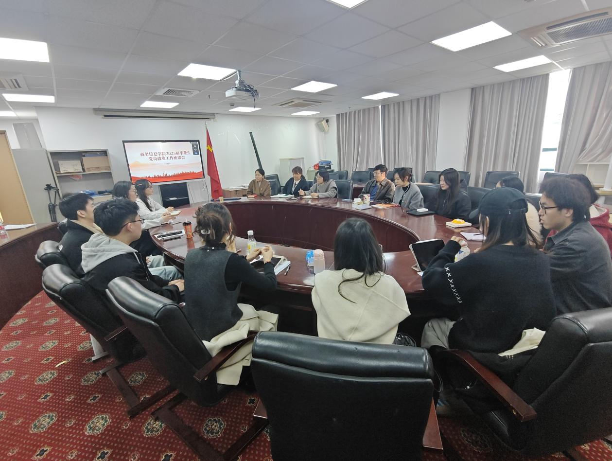为深入了解毕业生党员就业动态,加强就业指导与服务,充分发挥毕业生党员的先锋模范作用,商务信息学院党支部于3月18日下午5点在行政楼530召开2025届毕业生党员就业工作座谈会。学院党总支书记宋晓光、党总支副书记刘陈鑫、学生党支部书记魏玮、毕业班辅导员及全体毕业生党员参加会议。会议围绕当前就业形势、毕业生党员就业进展及职业规划展开交流,旨在凝聚共识、破解难题,助力毕业生高质量就业。
