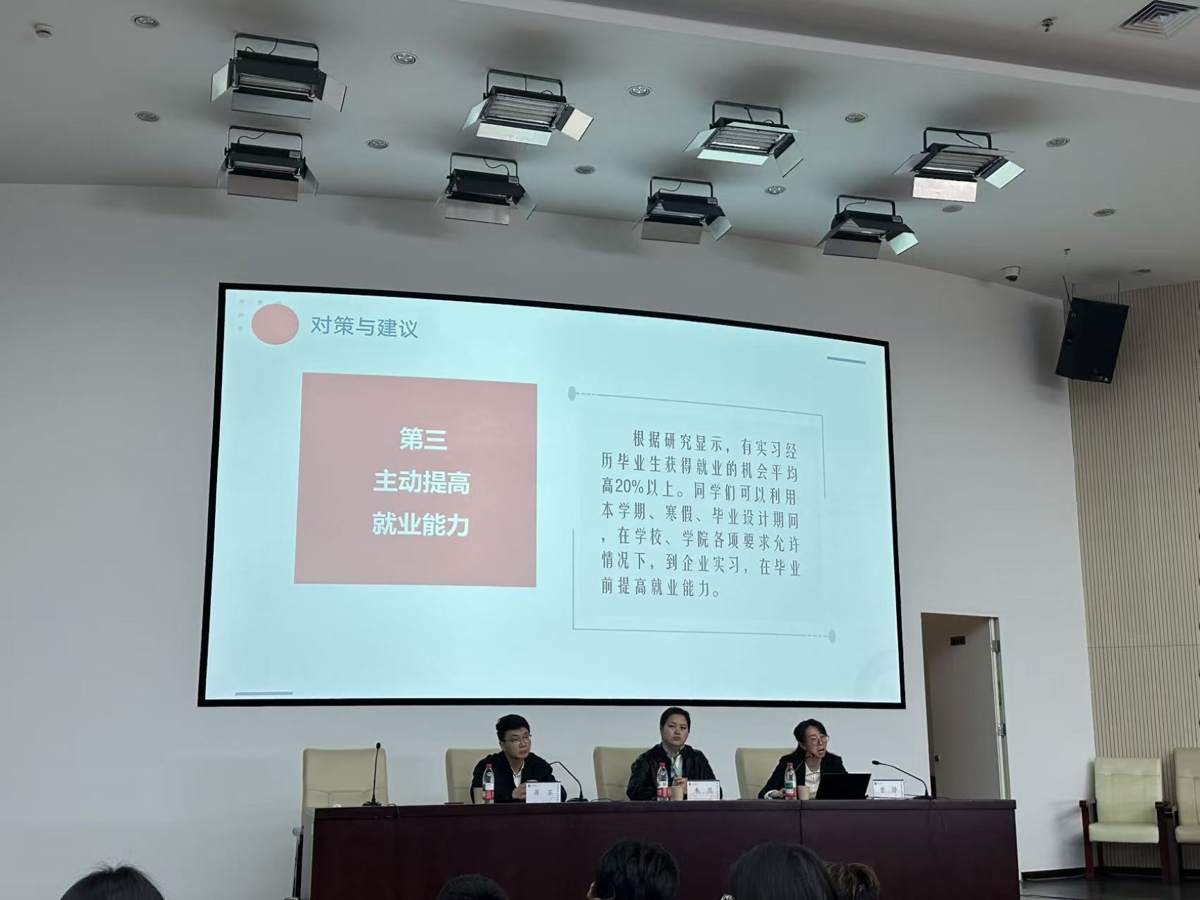 大会伊始,学院院长曹静围绕学院近年来就业创业工作展开详细介绍。她系统梳理了学院在毕业生就业指导、创业扶持等方面的成果,同时结合当前就业市场趋势,深入分析了 2026 届毕业生面临的就业形势,并针对性地提出三点建议:一是坚定信心,调整预期,积极就业,引导毕业生客观看待就业环境,以积极心态面对求职挑战;二是主动获取就业信息,抢抓就业关键期,鼓励毕业生多渠道关注招聘动态,把握秋招、春招等重要求职节点;三是主动提升就业能力,建议毕业生结合岗位需求,强化专业技能与实践能力,为求职做好充分准备。