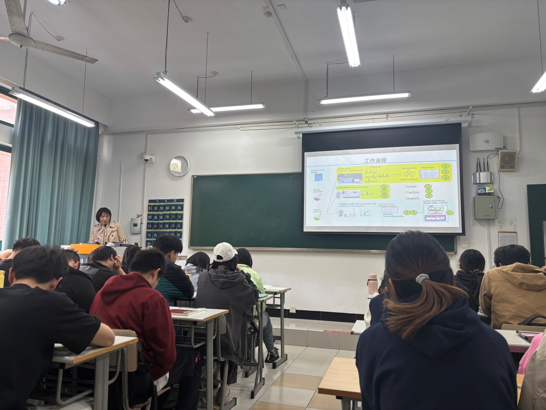 课堂上,古淑青从上海海关动植物与食品检验检疫技术中心的日常工作入手,详细讲解了上海海关动植物与食品检验检疫技术中心的工作流程、检验方法及抽检规则,接下来重点介绍了质谱技术的发展、仪器部件和作用、工作流程以及质谱技术在食品农药残留、食品过敏原分析和食品的掺伪掺假鉴别等方向的应用,此外还系统为同学们科普了进出口食品详细的检验检疫流程。古老师结合自身丰富的工作经历,通过实际的案例分享,使同学们更好地掌握专业知识。互动交流中,学生们围绕职业发展议题踊跃提问,古教授鼓励学生们在夯实基础的同时关注学科动态,培养动手实践和创新思维能力,理论与实践相结合。